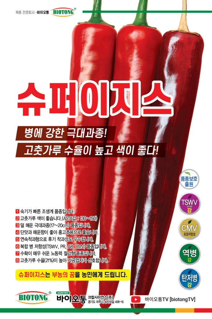 고추 슈퍼이지스 바이오통크랍사이언스㈜ 031-994-4199 병에 강한 극대과종! 고추가루 수율이 높고 색이 좋다