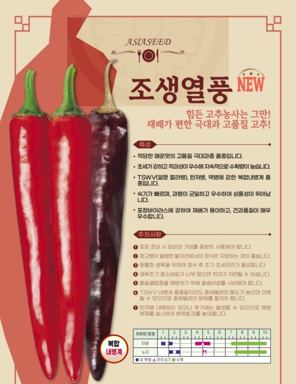 고추 조생열풍 아시아종묘㈜ 02-443-4303 힘든 고추농사는 그만! 재배가 편한 극대과 고품질 고추!