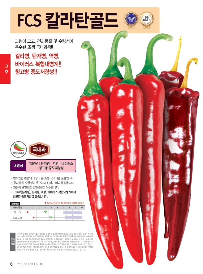 | 고추 | FCS칼라탄골드 | 사카타코리아㈜ | 02-3474-6671 | 조생 극대과 건고추, TSWV·탄저병·역병 복합내병계, 청고병 중도저항성 |