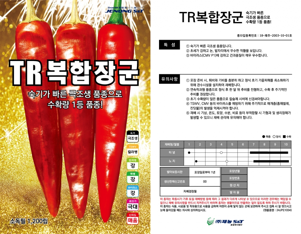 | 고추 | TR복합장군 | ㈜제농S&T | 010-8506-0809 | 숙기가 빠른 조생품종으로 수확량 1등 품종! |