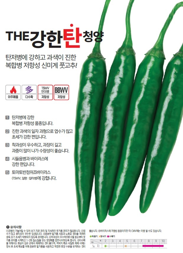 | 고추 | THE강한탄청양 | ㈜팜한농 | 1644-0901 | 탄저병에 강하고 과색이 진한 복합 병 저항성 신미계 풋고추! |