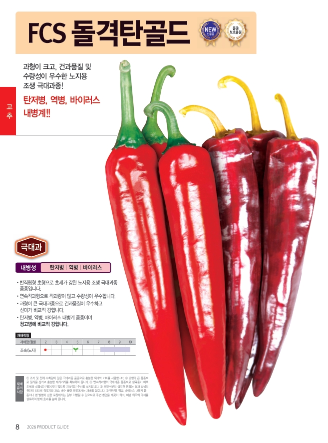 | 고추 | FCS돌격탄골드 | 사카타코리아㈜ | 02-3474-6671 | 노지용 조생 극대과종, 탄저병 · 역병 · 바이러스 내병계 |