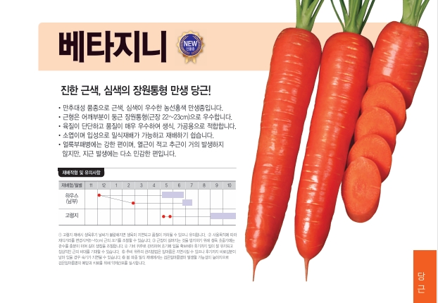 | 당근 | 베타지니 | 사카타코리아㈜ | 02-3474-6671 | 만추대성, 만생, 장원통형, 근색·심색 우수, 얼룩부패병 강, 열근 발생 적음 |