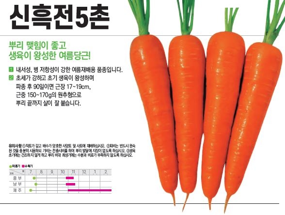 | 당근 | 신흑전5촌 | 팜한농 | 02-3159-5882 | 뿌리 맺힘이 좋고 생육이 왕성한 여름당근 |
