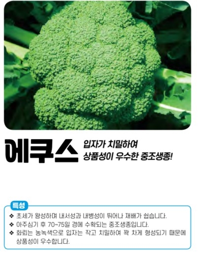 | 브로콜리 | 에쿠스 | 아시아종묘㈜ | 02-443-4303 | 입자가 치밀하여 상품성이 우수한 중조생종! |