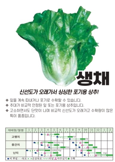 | 상추 | 생채 | 아시아종묘㈜ | 02-443-4303 | 신선도가 오래가서 싱싱한 포기용 상추! |