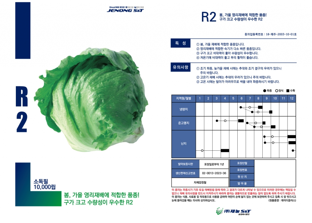 | 상추 | R2 | ㈜제농S&T | 010-8506-0809 | 봄, 가을 영리재배에 적합한 품종! 구가 크고 수량성이 우수한 R2 |