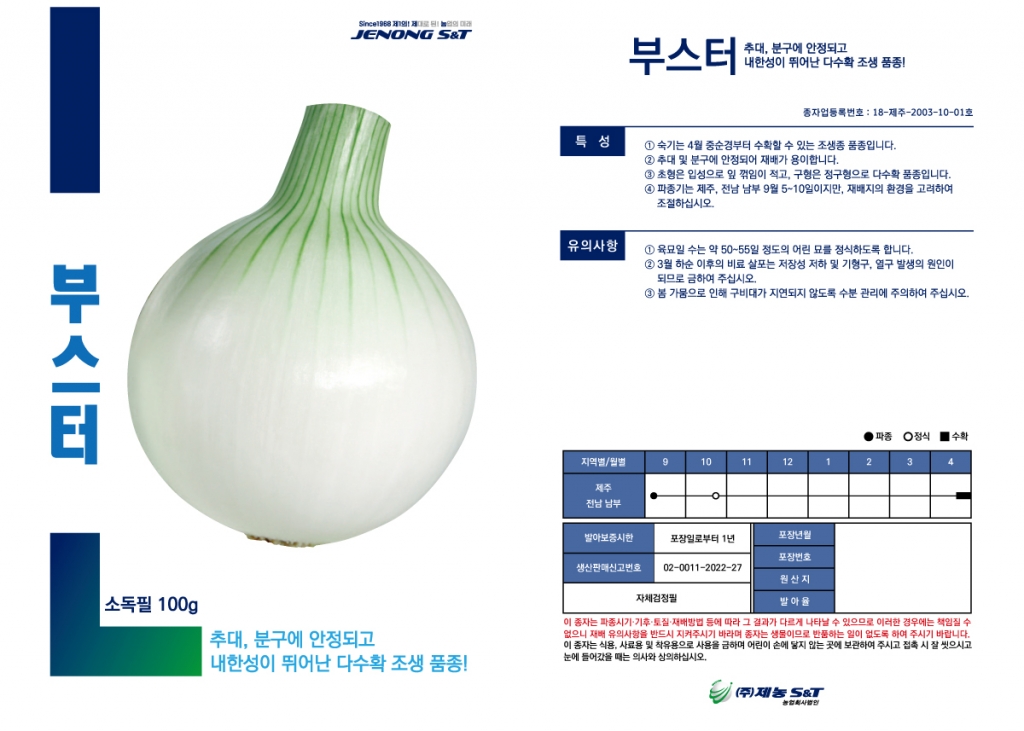 | 양파 | 부스터 | ㈜제농S&T | 010-8506-0809 | 분구에 안정되고 내한성이 뛰어난 다수확 조생 품종! |