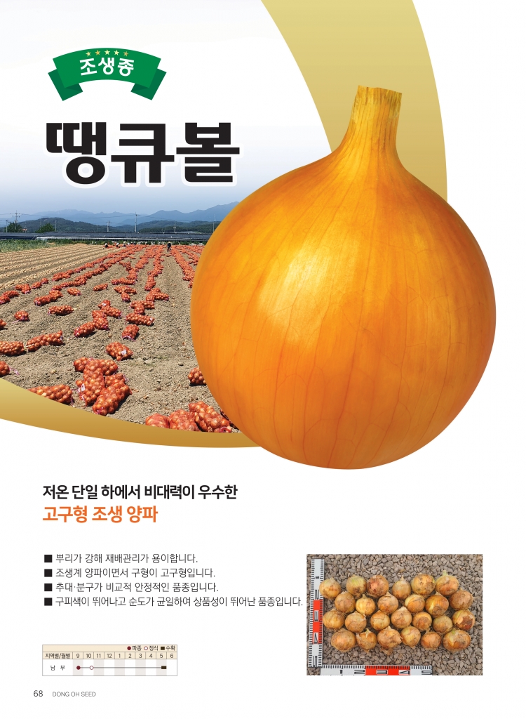 | 양파 | 땡큐볼 | ㈜경농 | 031-8010-8011 | 저온 단일 하에서 비대력이 우수하고 뿌리가 강한 고구형 조생 양파 |