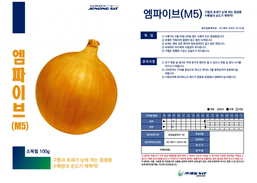 | 양파 | 엠파이브(M5) | ㈜제농S&T | 010-8506-0809 | 구형과 초세가 눈에 띄는 중생종! 수확량과 순도가 매력적! |