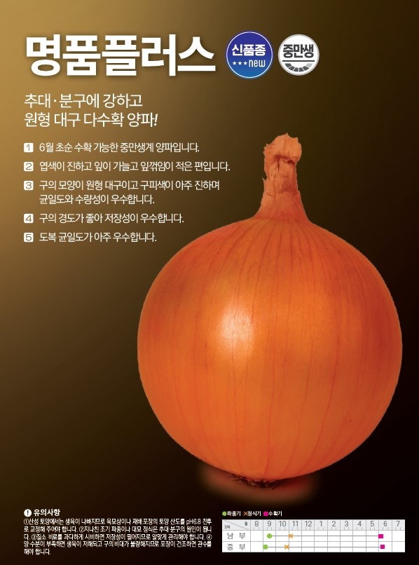 | 양파 | 명품플러스 | ㈜팜한농 | 1644-0901 | 추대·분구에 강하고 원형 대구 다수확 양파! |