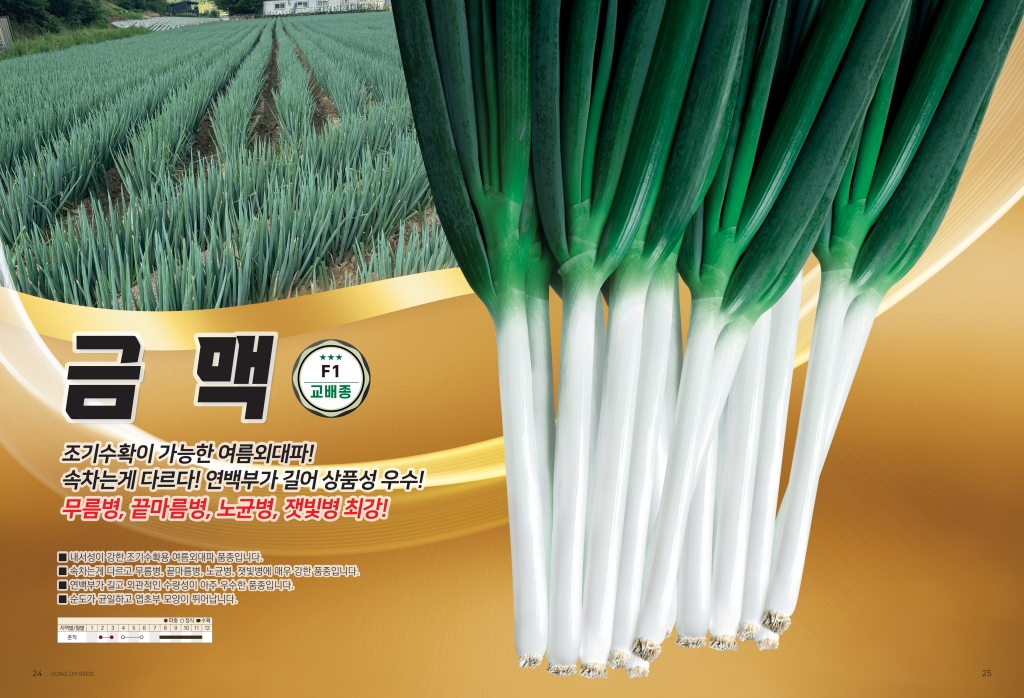 | 파 | 금맥 | ㈜경농 | 031-8010-8011 | 내서성이 강하며 연백부가 길고 상품성이 우수한 교배종 여름외대파 |