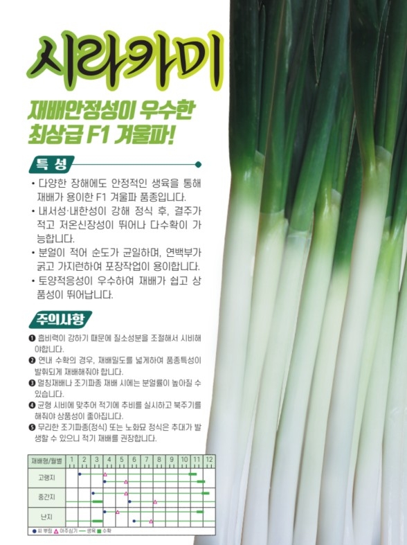 | 파 | 시라카미 | 아시아종묘㈜ | 02-443-4303 | 재배안정성이 우수한 최상급 F1 겨울파! |