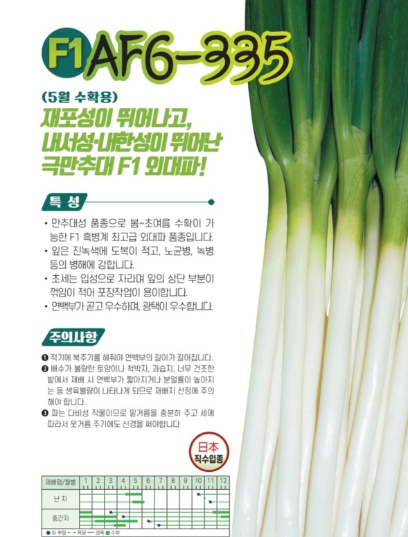 | 파 | AF6-335 | 아시아종묘㈜ | 02-443-4303 | 도복과 병해에 강하고, 연백부의 품질이 우수하다! |