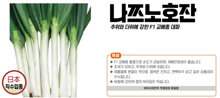 | 파 | 나쯔노호잔 | 아시아종묘㈜ | 02-443-4303 | 추위와 더위에 강한 F1 교배종 대파 |