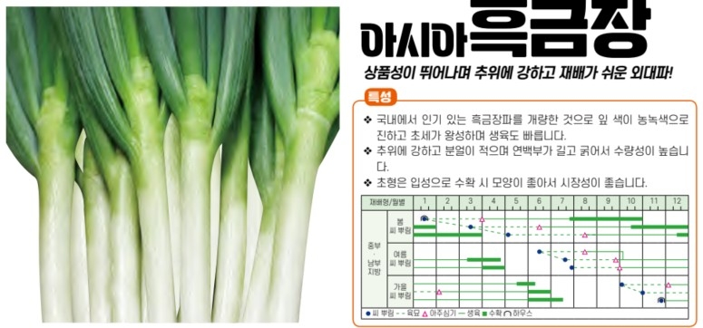 | 파 | 아시아흑금장 | 아시아종묘㈜ | 02-443-4303 | 상품성이 뛰어나며 추위에 강하고 재배가 쉬운 외대파! |
