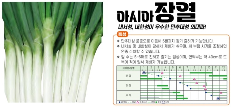 | 파 | 장열파 | 해성씨드플러스㈜ | 051-973-9697 | 안정된 만추대성의 다수확, 장기 저장성, 균일도가 높은 품종 |