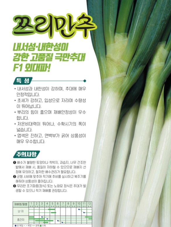 | 파 | 쯔리만추 | 아시아종묘㈜ | 02-443-4303 | 내서성 내한성이 강한 고품질 극만추대 F1 외대파! |