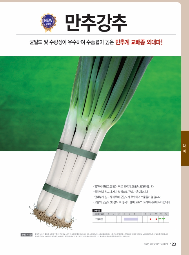 | 파 | 만추강추 | 사카타코리아㈜ | 02-3474-6671 | 만추계 교배종 외대파, 잎꺾임 적고 연백부 길고 두꺼움 |