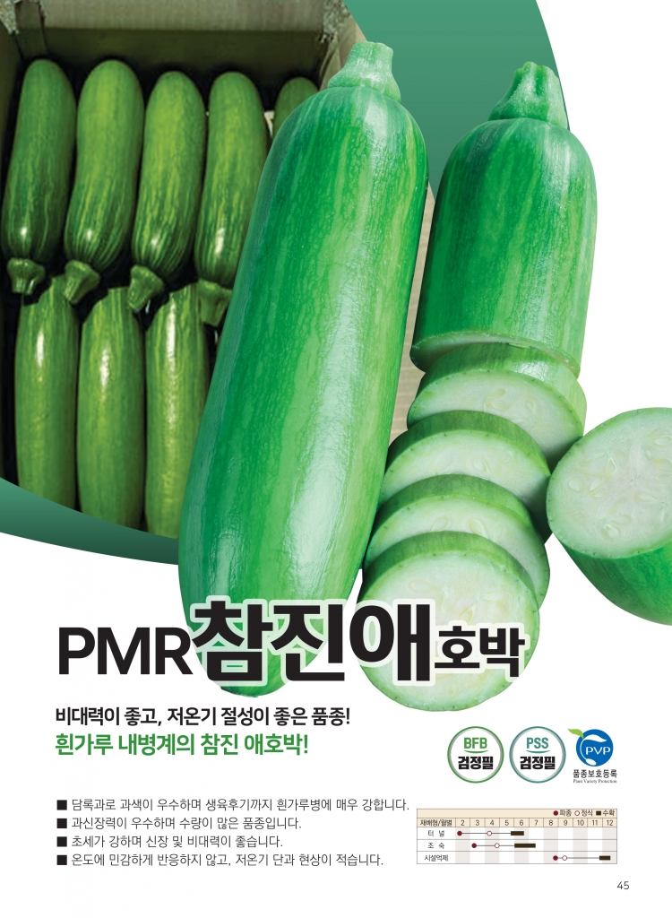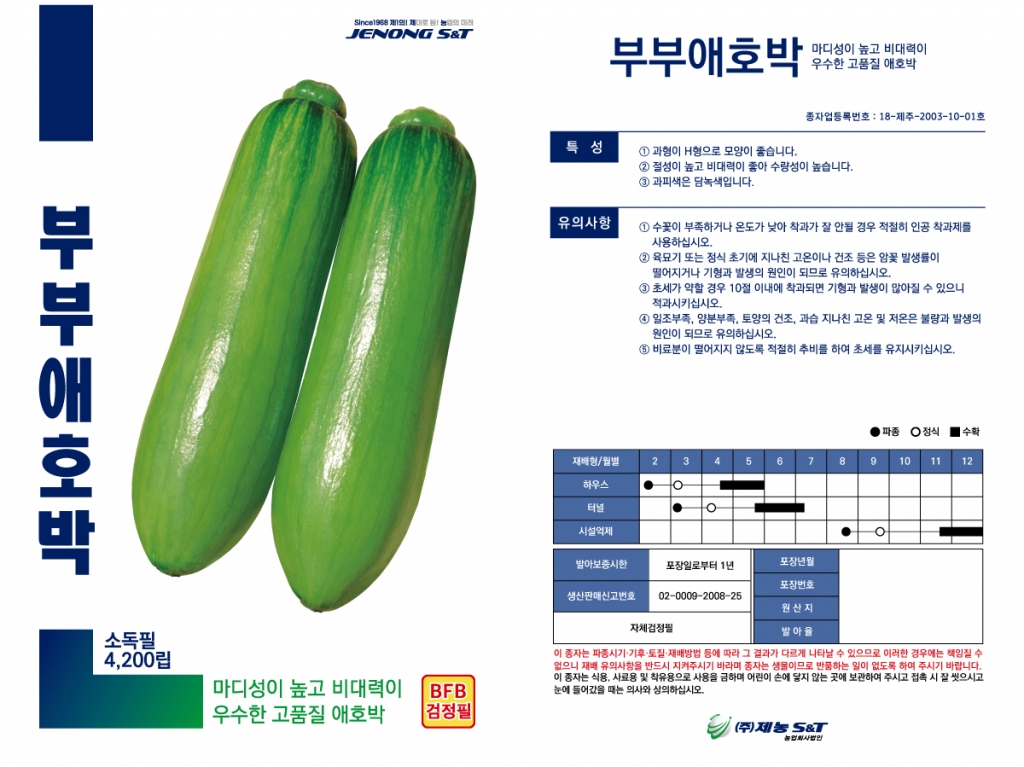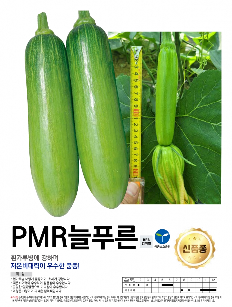 | 주요특성 | 흰가루내병성은 기본!! 저장성, 수량성까지 우수한 고품질 애호박!! 재배자에서 소비자까지 인정한 품종! |