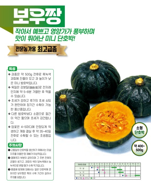 | 호박 | 보우짱 | 아시아종묘㈜ | 02-443-4303 | 작아서 예쁘고 영양가가 풍부하며 맛이 뛰어난 미니 단호박! |