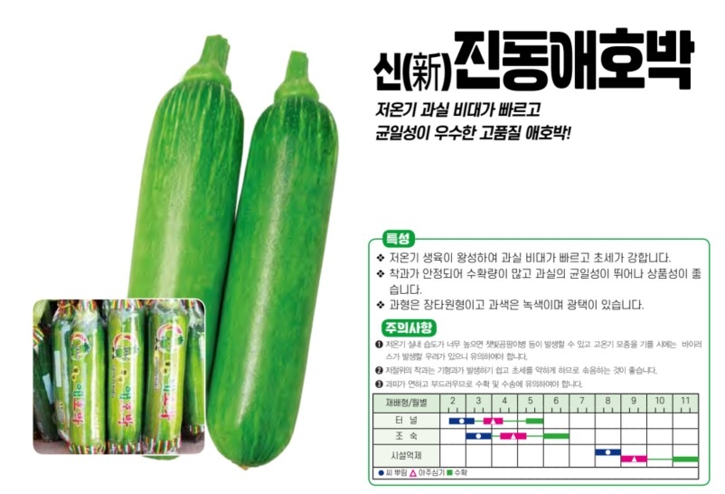 | 호박 | 신진동애 | 아시아종묘㈜ | 02-443-4303 | 저온기 과실 비대가 빠르고 균일성이 우수한 고품질 애호박! |