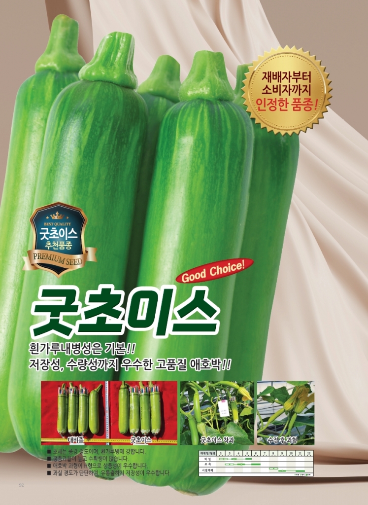 | 호박 | 굿초이스 | ㈜NH농우바이오 | 031-218-1176 | 흰가루내병성은 기본!! 저장성, 수량성까지 우수한 고품질 애호박!! 재배자에서 소비자까지 인정한 품종! |