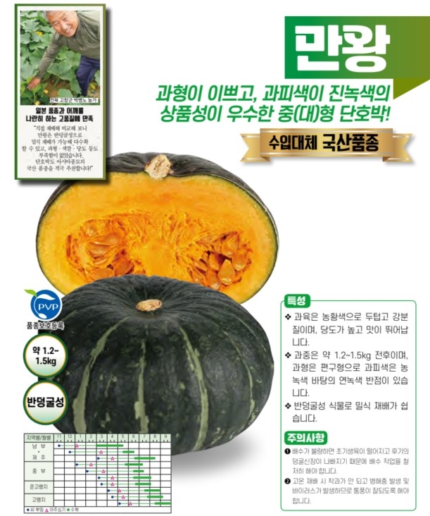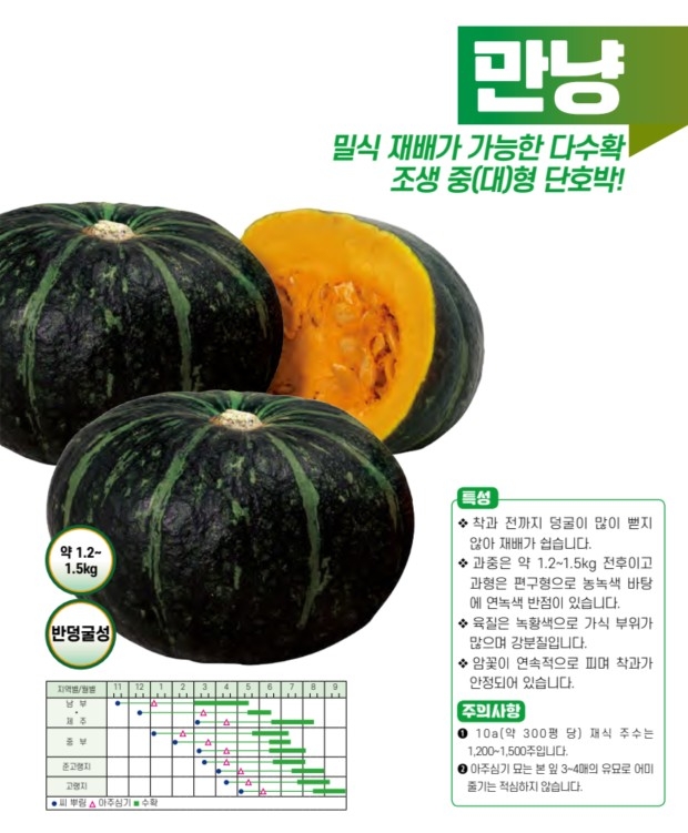 | 호박 | 만냥 | 아시아종묘㈜ | 02-443-4303 | 밀식 재배가 가능한 다수확 조생 중(대)형 단호박! |
