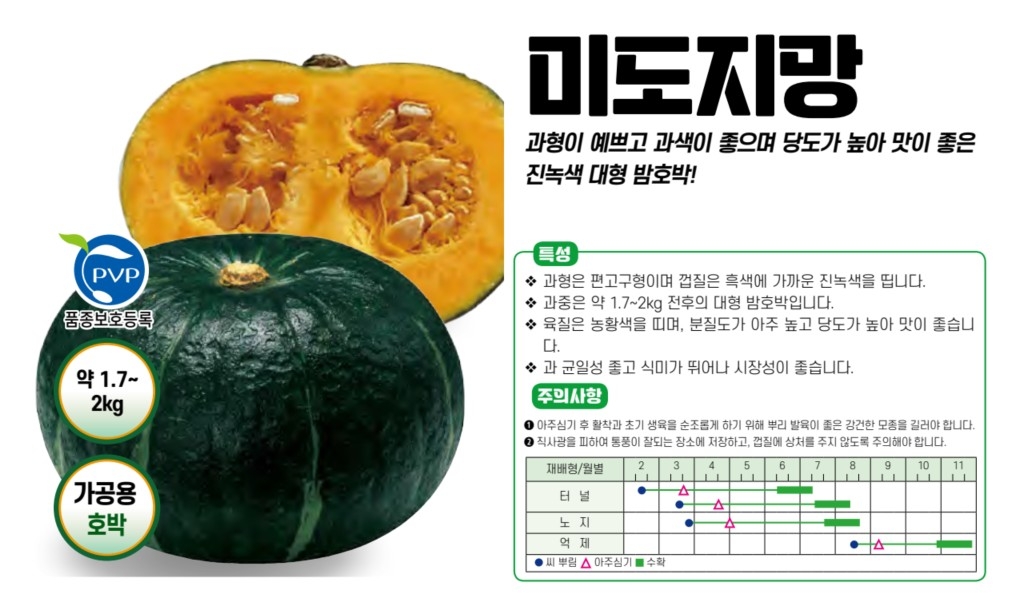 | 호박 | 미도지망 | 아시아종묘㈜ | 02-443-4303 | 과형이 예쁘고 과색이 좋으며 당도가 높아 맛이 좋은 진녹색 대형 밤호박! |